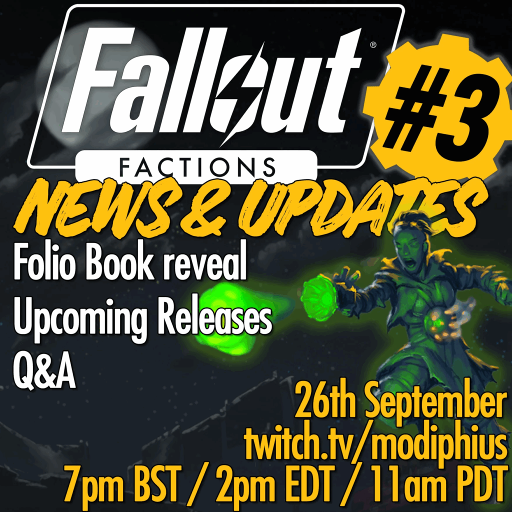 Am Freitag, den 26. September, um 20 Uhr gibt es auf Modiphius’ Twitch-Kanal spannende Neuigkeiten zu Fallout: Factions Folio Book! Steve, Evie, Jamie und Sam werfen nicht nur einen ersten Blick in das kommende Buch, sondern enthüllen auch etwas völlig Neues. Außerdem steht eine Q&A-Runde mit dem Team an – perfekt, wenn du Fragen oder Feedback zum Spiel hast. Wir veranstalten im Discord eine Watchparty und du bist da herzlich eingeladen.