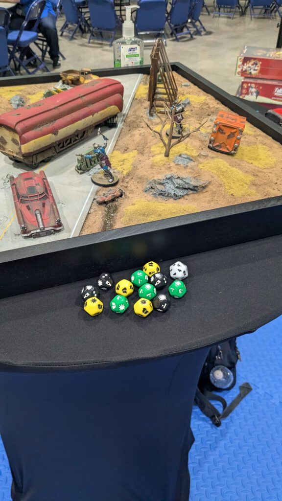 Da der KI-Gegner keine S.P.E.C.I.A.L.-Werte besitzt, funktioniert hier die Probe anders. „We are trying to keep the dice on our side of the table.“ bedeutet, dass ein KI-Modell immer trifft, du aber mit einem END-Test den Angriff negieren kannst. Das bedeutet, dass du immer einen gelungenen Test haben willst, ansonsten freut sich die KI. Ein grüner Würfel simuliert hierbei eine Ungenauigkeit beim Angriff der KI.a der KI-Gegner kein S.P.E.C.I.A.L. besitzt, funktioniert hier die Probe anders. „We are trying to keep the dice on our side of the table.“ bedeutet, dass ein KI-Modell immer trifft, du aber mit einem END-Test den Angriff negieren kannst. Bedeutet, dass du immer einen gelungenen Test haben willst, ansonsten freut sich die KI. Ein grüner Würfel hierbei simuliert dann eine Ungenauigkeit im Angriff der KI.