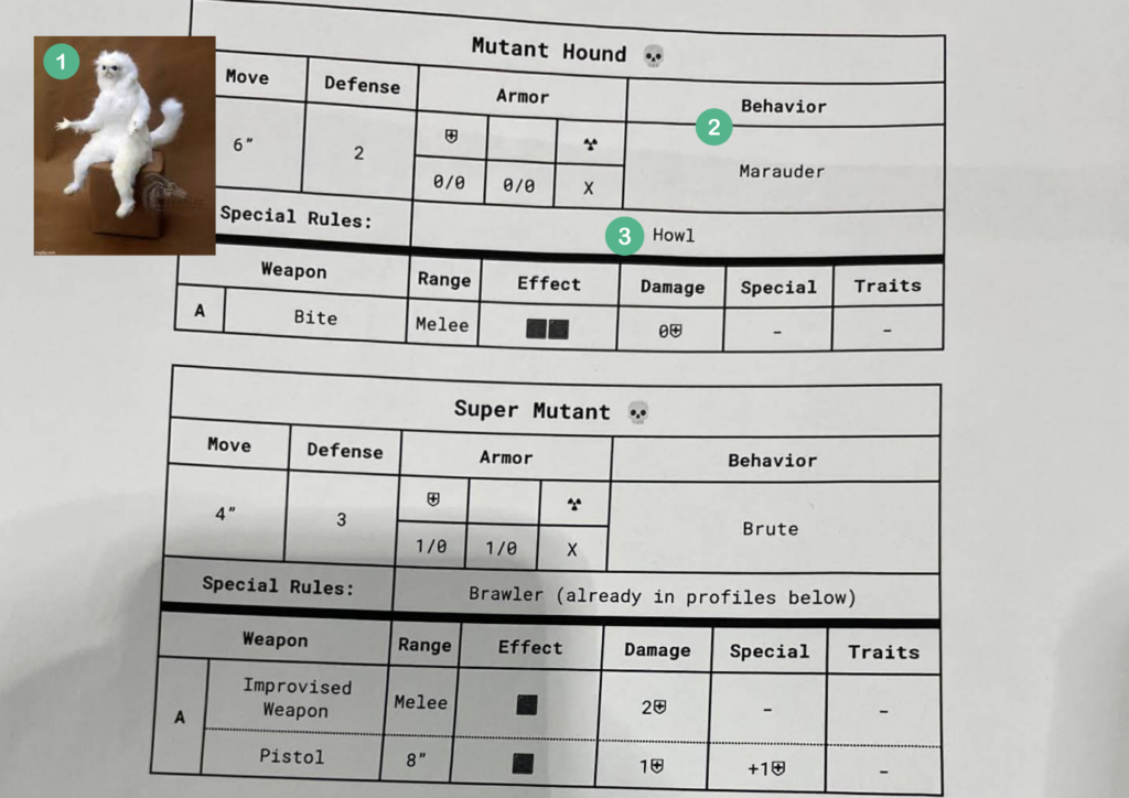 Ähnlich wie bei Fallout: Factions. Die Klammer in Range ist die kurze Reichweite. Effect gib dir die Anzahl und Farbe der zusätzlichen Würfel wieder. Specials erhält man bei kritischen Treffer und die Traitrs sind generelle Eigenschaften der Waffe (z.B. Compact = zählt nicht gegen die Traglast)