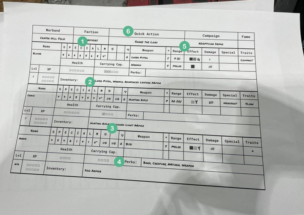 Die altbekannten Werte des Fallout-Universums sind natürlich dabei. Dazu gesellt sich nun der Movement-Wert, der die Bewegung in Zoll angibt.