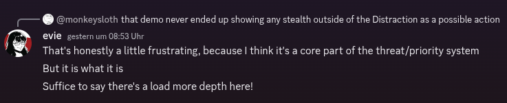 Evie kommentierte im Discord, dass eine Kernmechanik der Demo leider nicht gezeigt wurde. Die „Stealth“-Mechanik sollte eigentlich in den Fokus gerückt werden und so zeigen, dass die Prio- und Gefahrenlevel-Abhandlung viel mehr Tiefe hat. Nachtrag: Mittlerweile wurden die Mechaniken von Daniel nachgereicht, steht weiter unten.