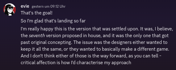 Lassen wir mal Evie kommentieren. Als Lead Game Designerin freut sie sich natürlich über positives Feedback aus seiner Bubble. Sie beschreibt seinen schwierigen Weg bis zu dieser Version kurz im Discord (Quelle).