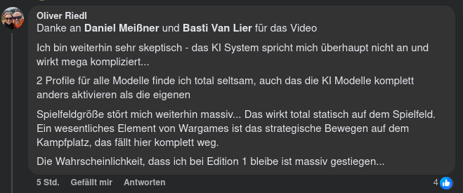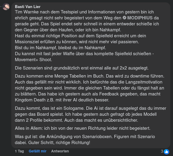 Es gibt aber auch verhaltene Meinungen zu den neuen Regeln. Olli zum Beispiel, die Galionsfigur der deutschen Fallout-Tabletop-Szene, tendiert eher zur ersten Edition (Quelle: Facebook).