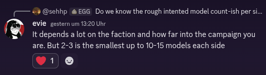 Evie erwähnt, dass die Modellanzahl auch vom Fortschritt der Kampagne und der Fraktion abhängt, beziffert sie aber mindestens bei 2 bis 3 Modellen auf bis zu 10 bis 15 Modellen je Seite für große Schlachten. Außerdem erwähnt sie, dass die Plastikboxen den Kern einer Fraktion darstellen (Quelle).