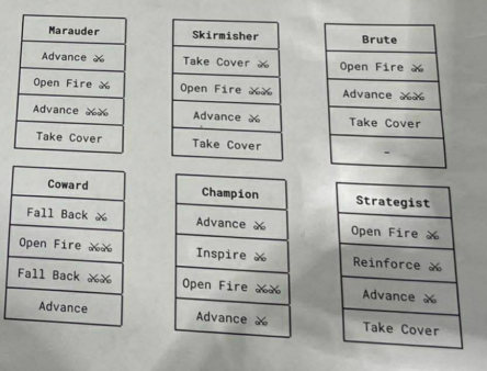 Das Verhalten steuert die Arten der Aktionen, die eine Einheit dann abhandelt, sofern sie das kann. Beispiel Marauder macht zuerst 1x Advance, 1x Open Fire, 2x Advance, Take Cover. Eine Einheit mit Brute hat eine andere Aktionsreihenfolge usw.