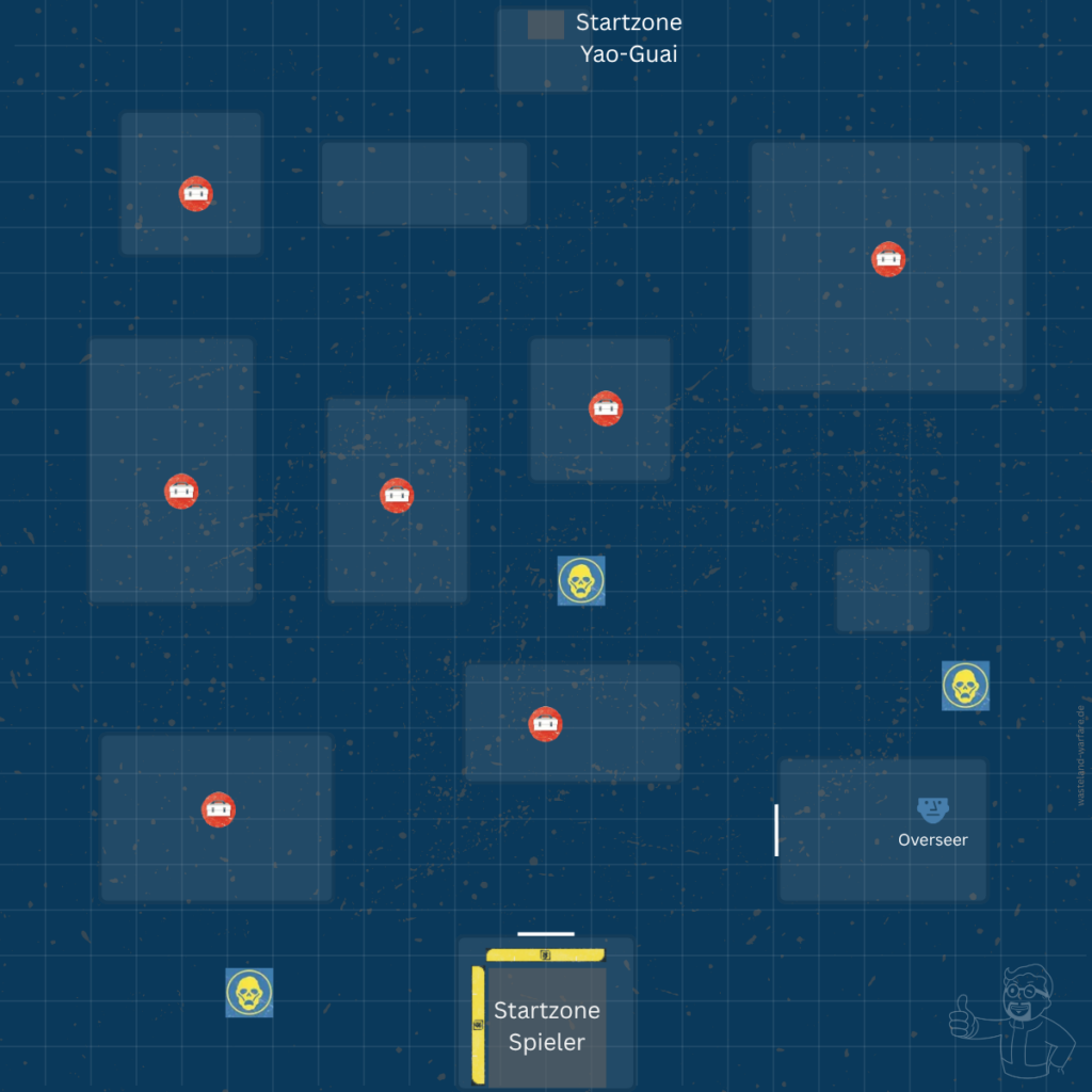 Gespielt wird auf einen 90cm x 90cm großem Vault mit mindestens verschieden großen 8 Räumen.
